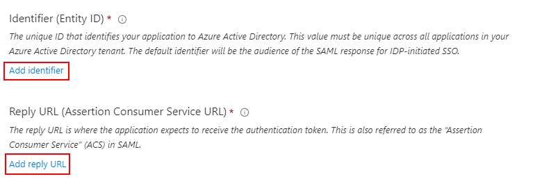 Pour finir la configuration Azure requière de renseigner l’Identifier et la Reply URL (Assertion Consumer Service URL) :