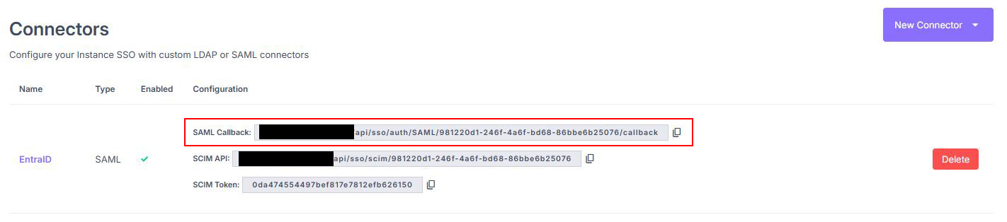 3) Validez pour générer l’ URL de callback du connecteur. Vous en aurez besoin dans EntraID (Single sign-on URL).