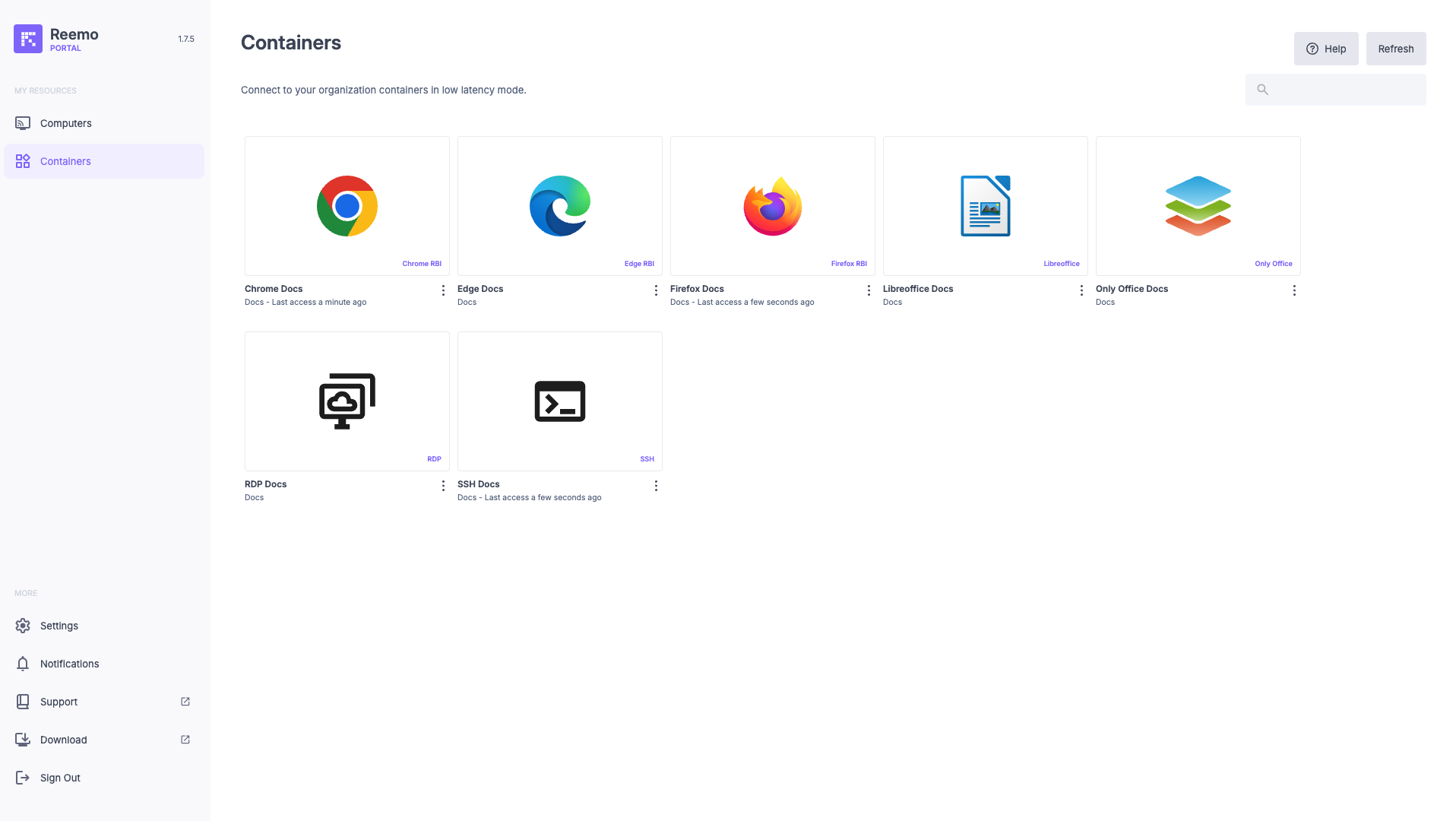 Vue de la page Containers affichant plusieurs conteneurs d’applications (navigateurs, suite bureautique, accès distant).¶