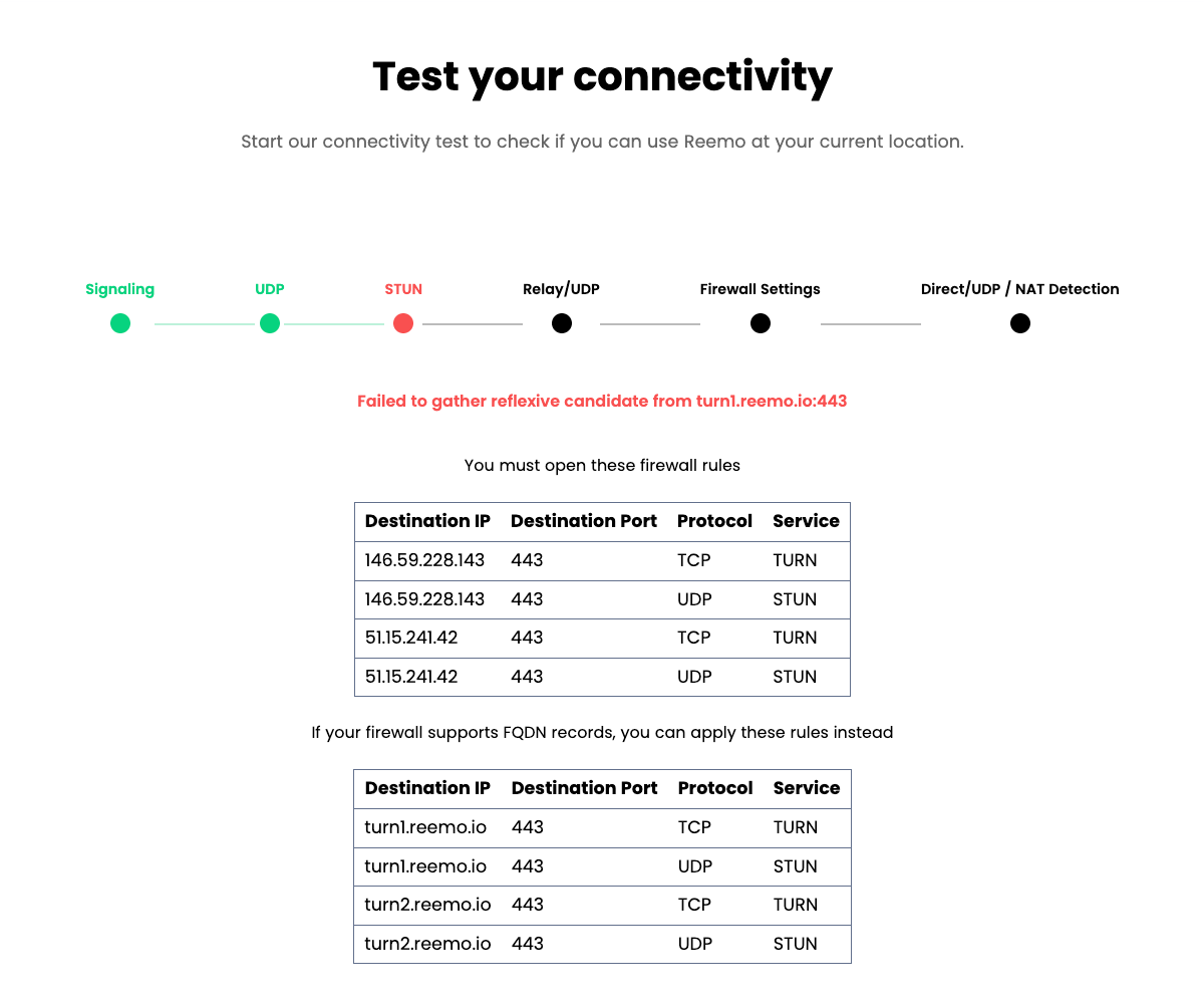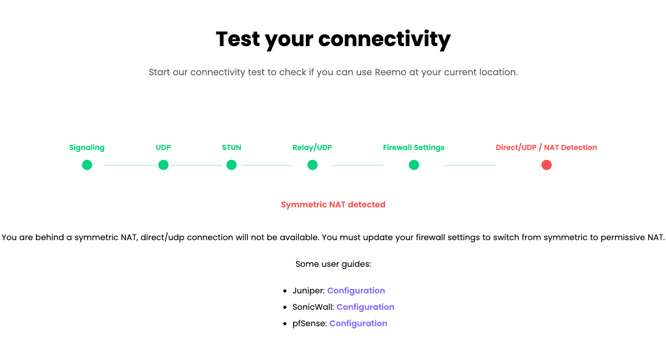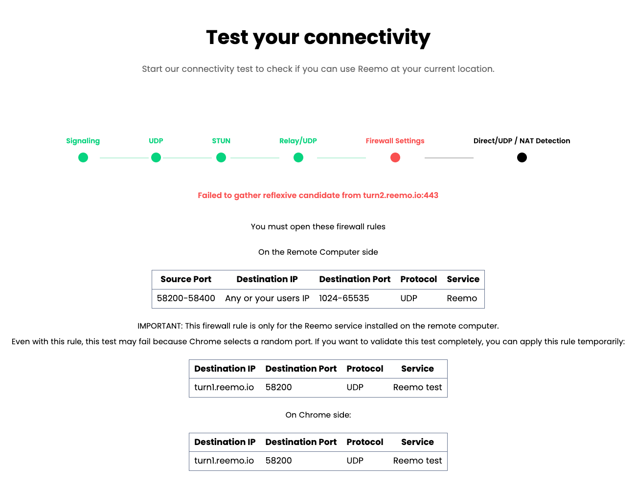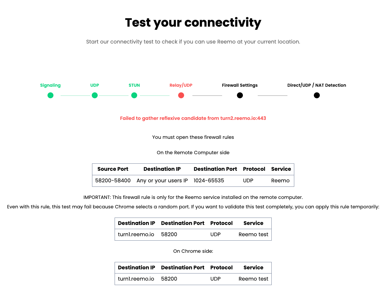 Une dernière connexion WebRTC est lancée, interrogeant nos serveurs TURN afin de détecter votre type de NAT. Si vous êtes derrière un NAT symétrique, ce test échouera. Vous pourrez toujours utiliser Reemo, mais uniquement en connexion Relay/UDP.