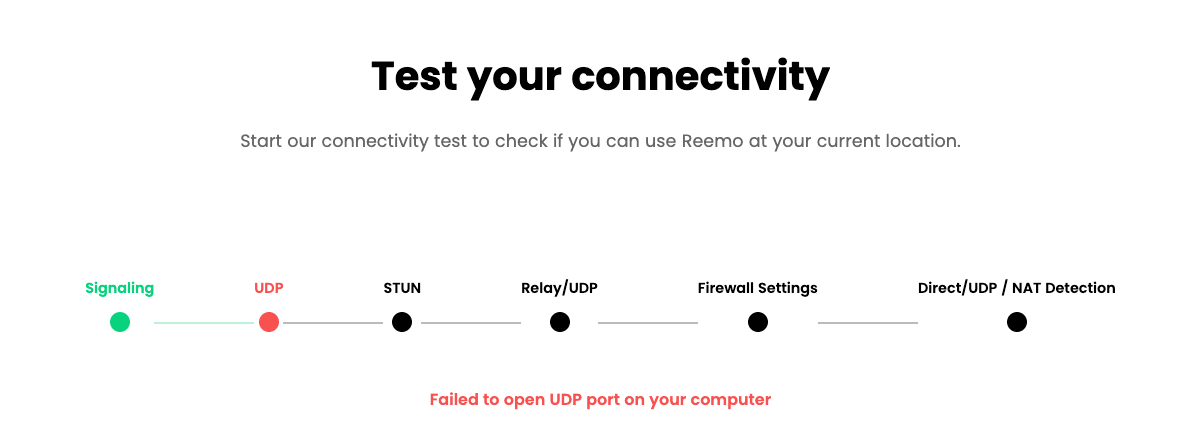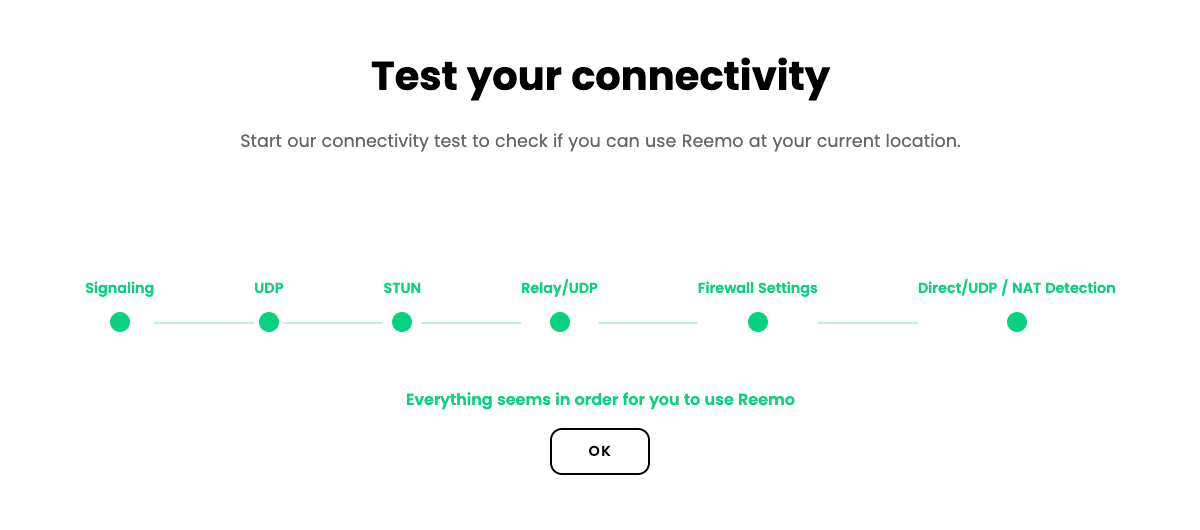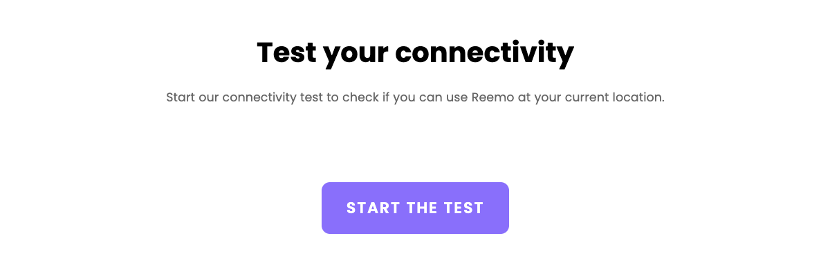 Reemo met à disposition de ses utilisateurs une page de test de connectivité. Cette page permet de vérifier chaque étape nécessaire pour utiliser Reemo avec les meilleures performances réseau possibles. Le test est accessible ici : https://reemo.io/test