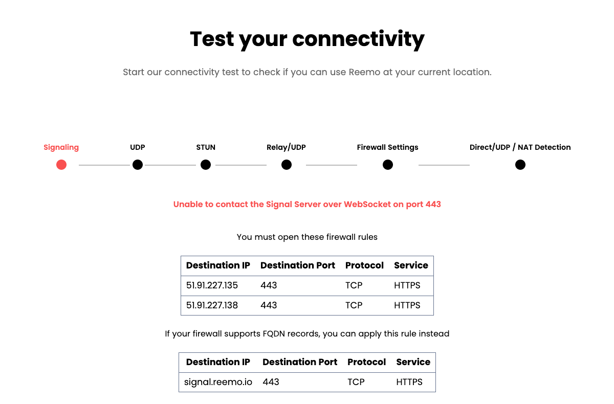 Une connexion est établie avec nos serveurs de signalisation via WebSocket sur le port 443. Si les serveurs de signal ne sont pas accessibles, ce test échouera et vous devrez ouvrir les règles de pare-feu décrites dans le message d’erreur.