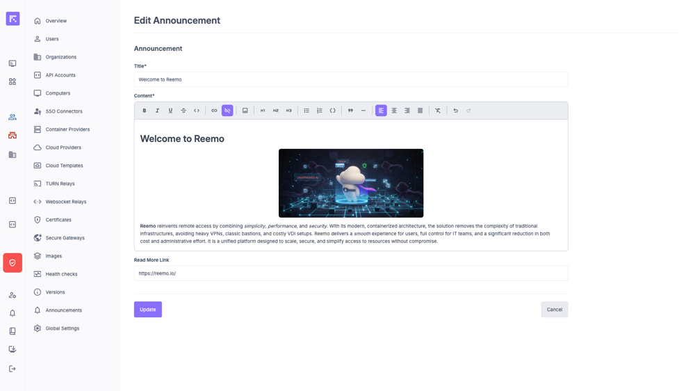 Announcements consist of a title, rich text content, and an optional external link.