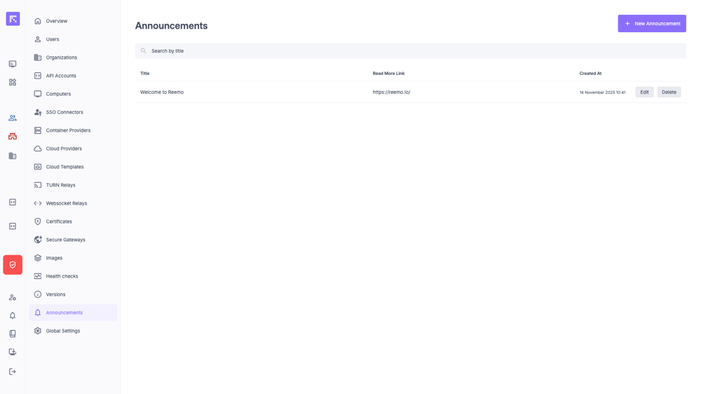 The Announcements page centralizes the management of announcements visible to all users.