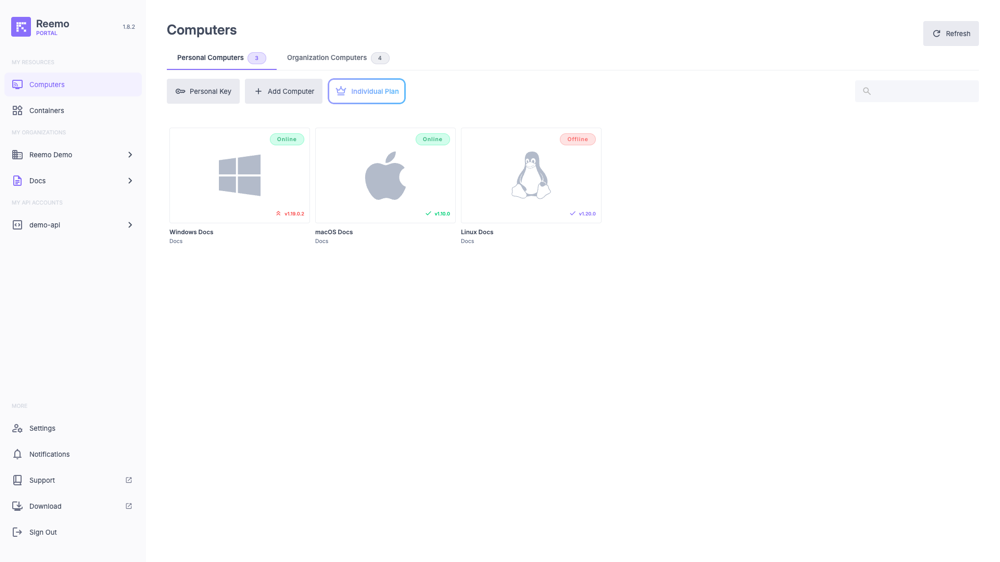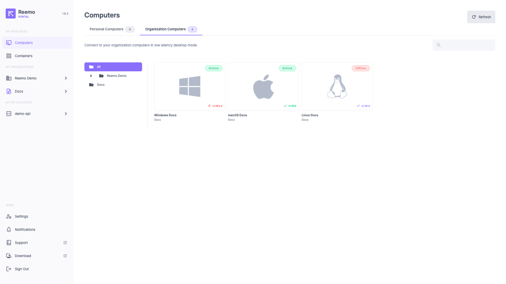 The Computers page allows you to manage and access the computers linked to your account. From this page, you can access all your personal computers where the Reemo Agent is installed, as well as all the workstations provided by your Organization through the Reemo portal.